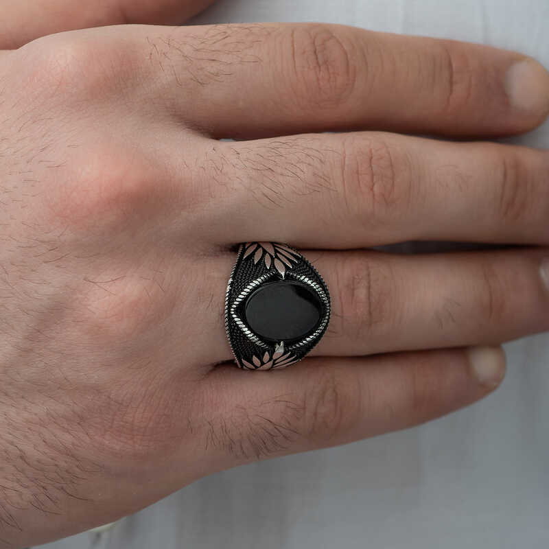 Gümüş Oniks Taşlı İşlemeli Erkek Yüzük