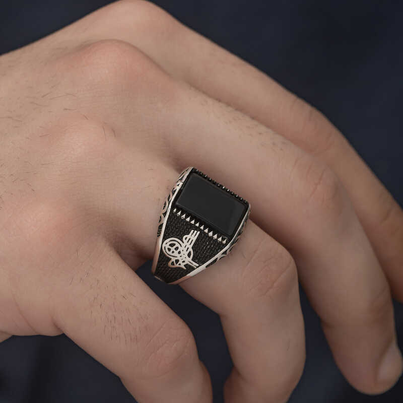 Gümüş Oniks Taşlı Tuğra Erkek Yüzük