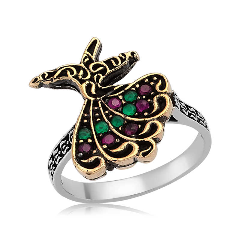 Sema’ eden canlara Sema"zen denilmiştir. Sema’, sembolik olarak, kâinatın oluşumunu, insanın âlemde dirilişini, Yüce Yaratıcı’ya olan aşk ile harekete geçişini ve kulluğunu idrak edip “İnsan- ı Kâmil” e doğru yönelişini ifâde eder.Semazen"in başına giydiği sikkesi onun mezar taşını, üstündeki tennuresi kefenini omuzuna aldığı hırkasıda mezarını temsil eder. Yani o ölmeden ölmüş, hak ile hak olmuştur… Semazenin sağ elleri yukarı sol elleri aşağı dönüktür sema esnasında… Yani "haktan alırım halka veririm". der. Maneviyatı yüksek bu modeli; doğum günü hediyesi, sevgililer günü hediyesi veya annelere hediye olarak özel günlerde tercih edebilirsiniz. Gümüş Semazen Bayan Yüzük 925 ayar gümüşten imal edilmiştir. Gümüş üzerine oksit ve rodyum kaplama yapılmıştır. Rodyum kaplama yapılan gümüş bayan yüzük modelleri parlaklığını uzun süre muhafaza eder, oksitlenmesi gecikir. Tüm gümüş bayan yüzük modellerinde olduğu gibi bu gümüş Semazen Bayan Yüzük modeli de tamamı el emeği ile üretilmiştir. Gümüş ve değerli taşlar nedeniyle belirtilen ortalama ürün ağırlığında ± %10 sapma olabilmektedir.