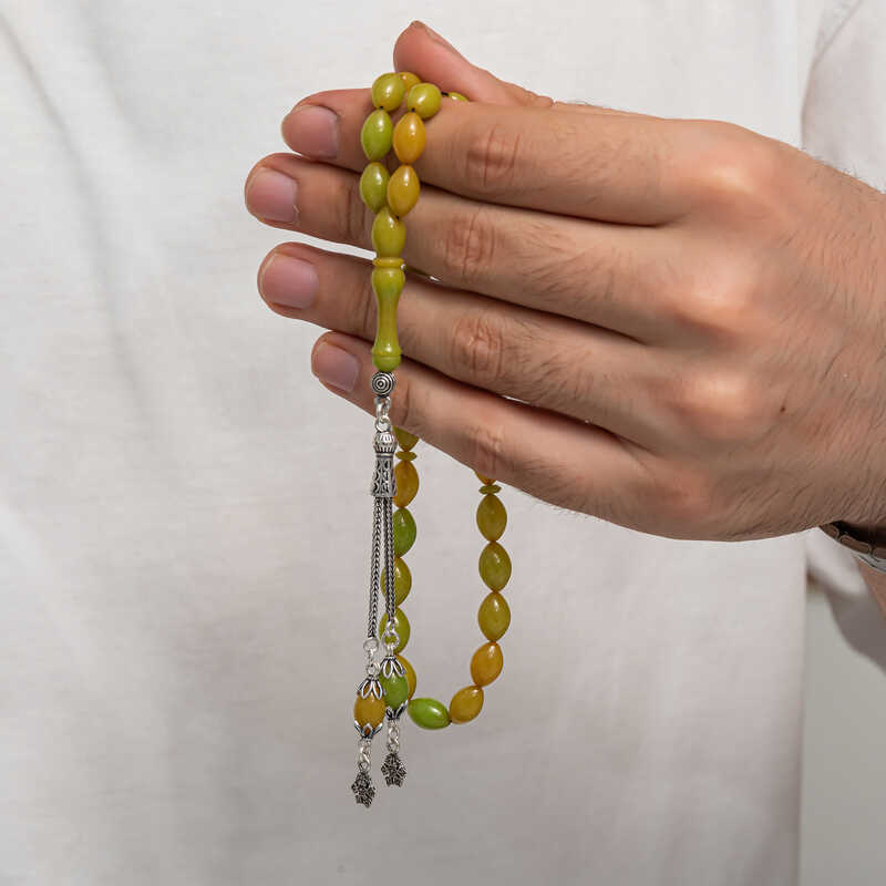 Kehribar, çam ağacı reçinesinin toprak altında uzun yıllar boyunca birikerek oluşan bir maddedir. Hemen hemen taş ile aynı sertliktedir fakat yoğunluğu düşüktür. Çam kokusu yayar. Oluşumu uzun zaman aldığından ve yapay olarak yapılamadığından değerli bir maddedir. Sıkma kehribar ise kehribar taşından farklı olarak onun özelliklerini taşıyan, görüntü itibariyle ona benzeyen fakat gerçek olmayan bir malzemedir. Ülkemizde ve dünyanın bir çok yerinde kehribar taşından çeşitli malzemeler üretilmiştir. Ülkemizde en yaygın olarak tesbih üretilmektedir. Kehribar tesbihler elde ısındıkça kehribar benzeri bir koku verir ve renk değiştirir. Bir çok rengi vardır. Hatta iki rengin birleşiminden oluşan kehribar tesbih modelleri de vardır. Genellikle gümüş püskül ile kullanılır veya sistemli olarak da kullanılabilir. Ülkemizin güzide tesbih ustaları bu malzemeyi sıklıkla işlemek suretiyle çeşitli sanat eserleri meydana getirirler. Bu tesbihler de koleksiyonerler tarafından alınıp satılmaktadır. Gümüş püsküllü sıkma kehribar tesbih modeli de günlük hayatta kullanılabilecek çok şık bir tesbih çeşididir. Özel günlerin vazgeçilmez hediyesi sıkma kehribar tesbihler erkekler için doğum günü, sevgililer günü ve babalar günü gibi özel zamanlarda hediye olarak tercih edilebilir. Gümüş püsküllü sıkma kehribar tesbih modeli diğer kehribar tesbih modellerinde olduğu gibi tamamen el emeği ile imal edilmiştir.