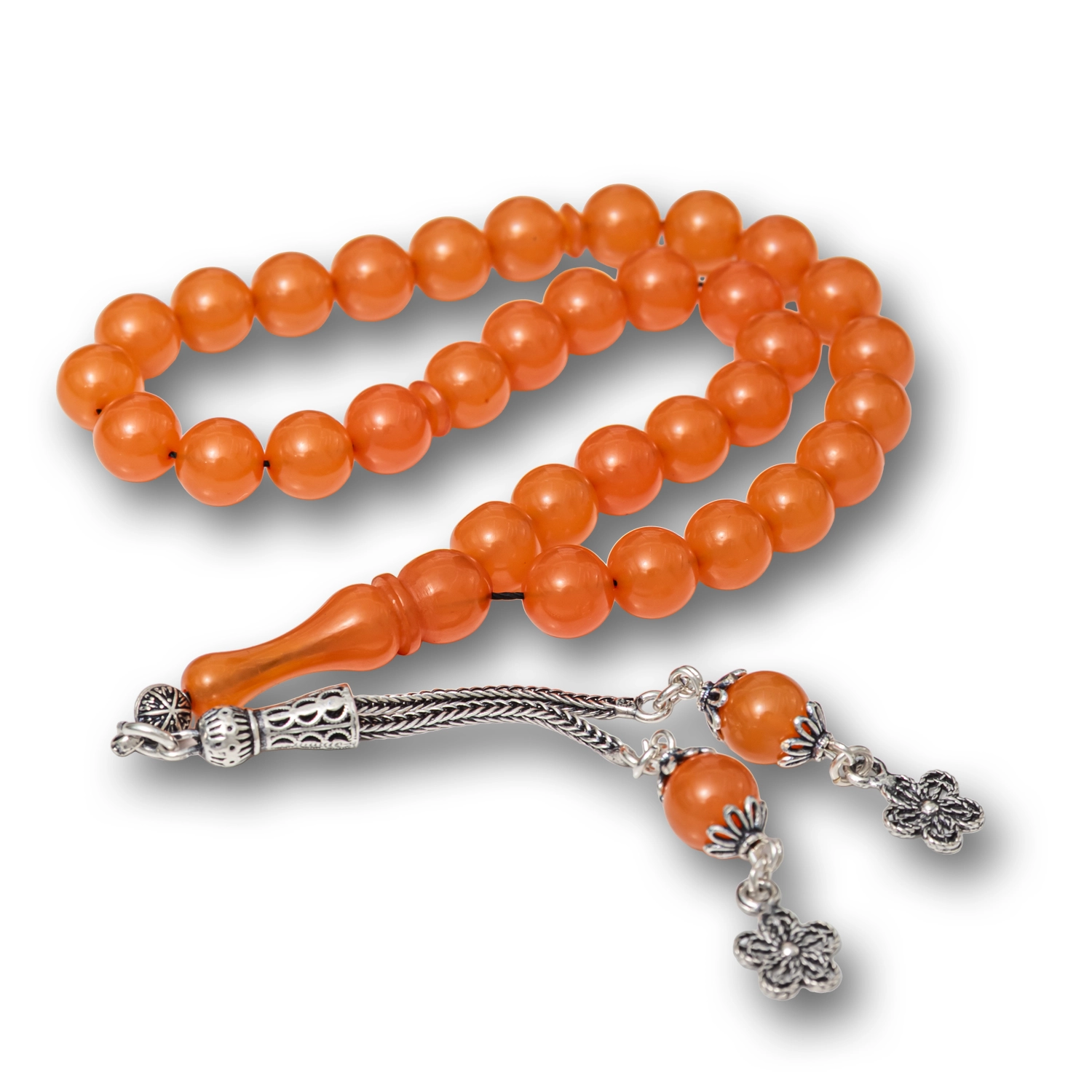 Gümüş Püsküllü Turuncu Yuvarlak Sıkma Kehribar Tesbih