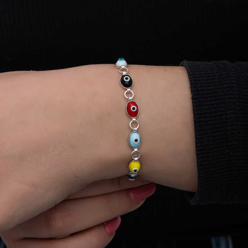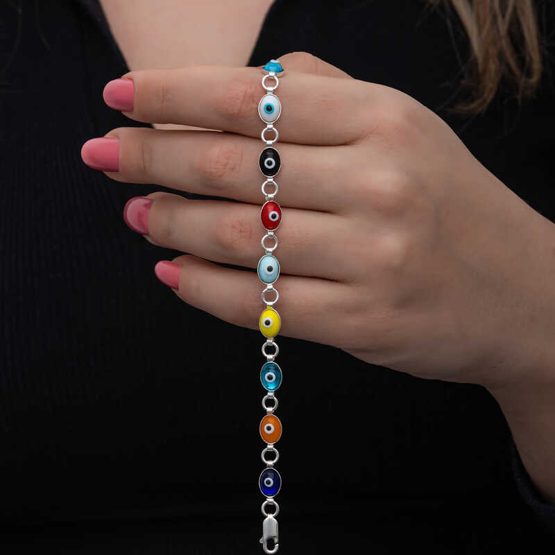 Nazar boncuğunu insanlar uzun yıllardan beri kötü bakıştan korunmak için kullanmışlardır. Kötü bakışların insanlar üzerinde olumsuz etki oluşturmasına karşı bir önlemdir nazar boncuğu… Bu sebeptendir ki insanlar sevdiklerini korumak için nazar boncuğu takmaktadır. Bu nazar bileklik de şıklığı ve zarafeti yansıtıyor. Rengarenk tasarımıyla göz alıcı şıklıkta… Her dönem sevilen ve şıklığından ödün vermeyen bu modeli; doğum günü hediyesi, sevgililer günü hediyesi veya annelere hediye olarak özel günlerde tercih edebilirsiniz. Renkli nazar kadın bileklik, 925 ayar gümüşten imal edilmiştir. Gümüş üzerine rodyum kaplama yapılmıştır. Rodyum kaplama yapılan gümüş kadın bileklikler parlaklığını uzun süre muhafaza eder, oksitlenmesi gecikir. Tüm gümüş kadın bilekliklerinde olduğu gibi bu gümüş renkli nazar kadın bileklik de tamamı el emeği ile üretilmiştir. Gümüş ve değerli taşlar nedeniyle belirtilen ortalama ürün ağırlığında ± %10 sapma olabilmektedir.