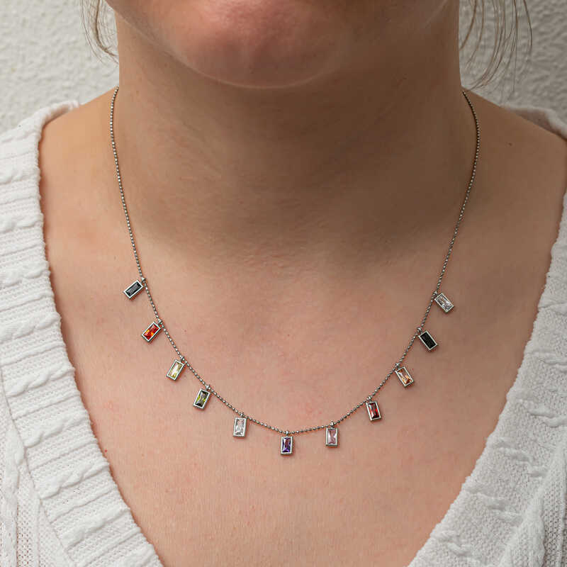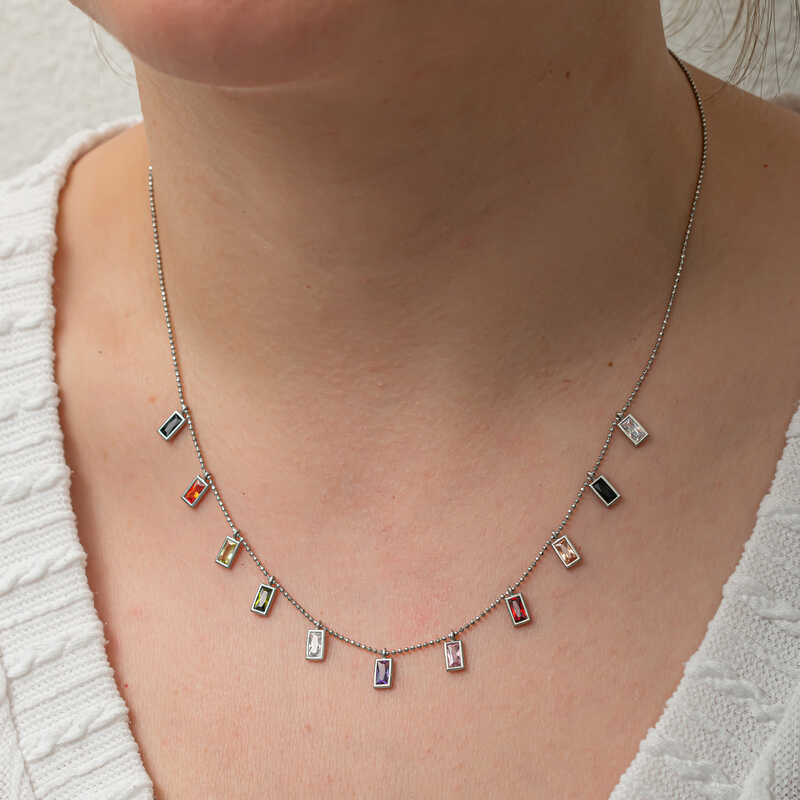 Kalbimizin ve ruhumuzun en eğlenceli tarafı olan rengarenk hayal dünyamızın yansıması özel tasarım renkli kolyeler… Bu şık kolyeyi doğum günü hediyesi, sevgililer günü hediyesi veya annelere hediye olarak özel günlerde tercih edilebilecek mükemmel bir seçenektir. Renkli kadın kolye 925 ayar gümüşten üretilmiştir.Gümüş üzerine rodyum kaplama yapılmıştır. Rodyum kaplama yapılan kadın şans kolyeleri parlaklığını uzun süre muhafaza eder ve oksitlenmesi gecikir. Tüm gümüş kolyelerde olduğu gibi gümüş renkli kadın kolye modeli de el emeği ile üretilmiştir. Gümüş ve değerli taşlar nedeniyle belirtilen ortalama ürün ağırlığında ± %10 sapma olabilmektedir.