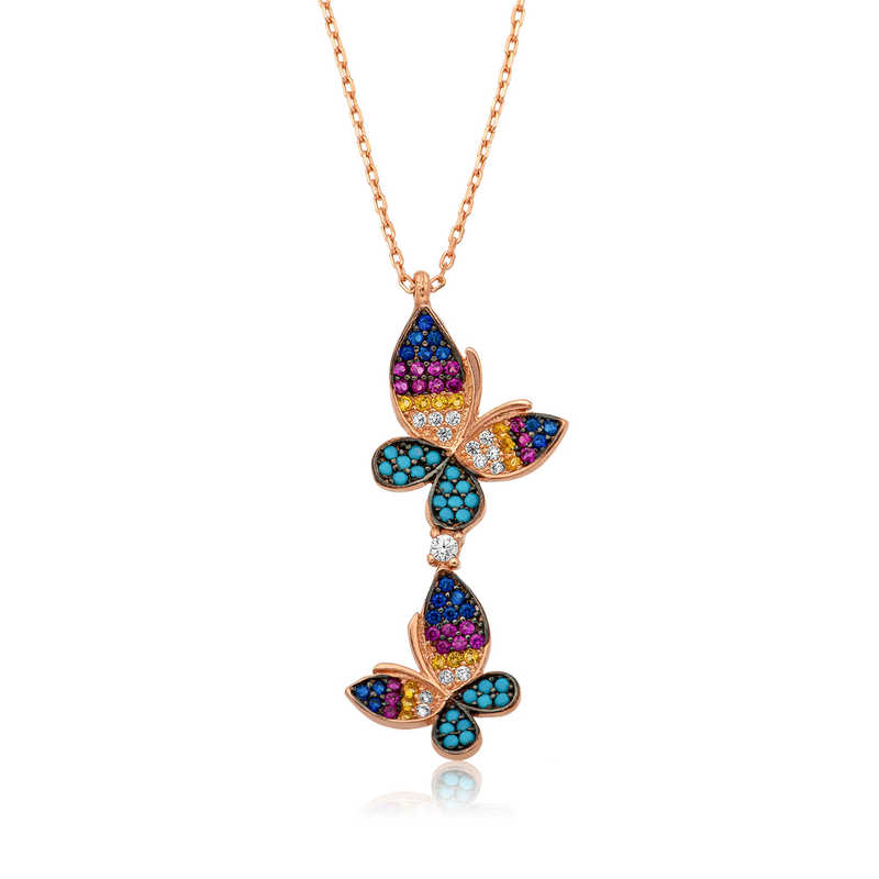 Tırtıldan kelebeğe bir dönüşüm. Rengarenk kanatları ile insanların beğenisini kazanmış bir canlıdır. Kelebek simgesi; huzur, mutluluk, gençlik ve romantizm duygularının tekrar canlanması, temiz ve saf bir sevgi değeri taşımaktadır. Bayanların genellikle kolye ve bileklikler de kullandıkları son derece zarif görüntü sunan kelebek modelleri; Yunan ve Uzak Doğu takı dünyasında popüler bir yer almakta, bedenin olgunlaşması temsil etmektedir. Psikolojik olarak ise kelebek modelleri için ruhun değişimi ve yenilenmesi olarak anlatılmaktadır. Bu şık kolye; doğum günü hediyesi, sevgililer günü veya özel günlerde tercih edilebilecek mükemmel bir seçenektir. Kolye 925 ayar gümüşten üretilmiştir. Gümüş üzerine rose altın kaplama yapılmıştır. Rose altın kaplama yapılan bayan kolyeler parlaklığını uzun süre muhafaza eder, gümüş rengini pembe renge dönüştürür ve oksitlenmeyi geciktirir. Tüm gümüş kolyelerde olduğu gibi gümüş kelebek kolye de el emeği ile üretilmiştir. Üzerinde bulunan taşlar zirkondur. Gümüş ve değerli taşlar nedeniyle belirtilen ürün ağırlığında ± %10 sapma olabilmektedir.
