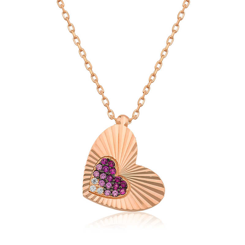 Kalp simgesi daima koşulsuz sevginin ve aşkın sembolü olmuştur. Dini öğretilerde ise kalbin gücü sınırsızdır. Çünkü kalp Yaradanın evi, bizim ise evrene açılan gerçeklik kapımızdır. İki kalp kolye sizi ve sevgilinizi temsil edecek en şık ve anlamlı kolyelerden biridir. Bu şık fırfır kalp bayan kolye; doğum günü hediyesi, sevgililer günü hediyesi veya annelere hediye olarak özel günlerde tercih edilebilecek mükemmel bir seçenektir. Gümüş zirkon taşlı fırfır kalp bayan kolye 925 ayar gümüşten imal edilmiştir. Bu kolye üzerinde rose kaplama yapılmıştır. Rose kaplama yapılan gümüş fırfır kalp bayan kolye modelleri parlaklığını uzun süre muhafaza eder. Üzerinde bulunan pembe renkli taşlar zirkondur. Tüm gümüş bayan kolye modellerinde olduğu gibi gümüş fırfır kalp bayan kolye modeli de el emeği ile üretilmiştir. Gümüş ve değerli taşlar nedeniyle belirtilen ortalama ürün ağırlığında ± %10 sapma olabilmektedir.