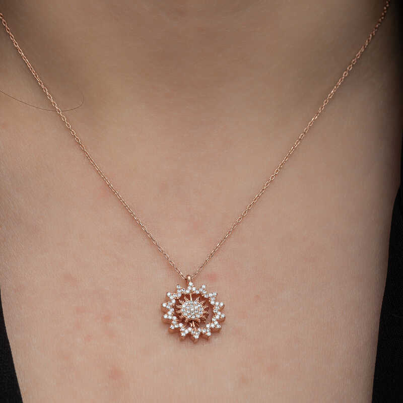 Güneş; ışığın, bilginin, iyiliğin, gücün ve yönetimin sembolüdür. Bu ışıl ışıl ve farklı tasarımıyla göz kamaştıran kolye; 925 ayar gümüşten imal edilmiştir. Gümüş üzerine gold kaplama yapılmıştır. Gold kaplama yapılan gümüş ürünler parlaklığını uzun süre muhafaza eder, oksitlenmesi gecikir. Gümüş beyaz taşlı güneş kadın kolye üzerinde bulunan taşlar zirkon"dur. Tüm gümüş kolyelerde olduğu gibi gümüş güneş kadın kolye de tamamı el emeği ile üretilmiştir. Gümüş ve değerli taşlar nedeniyle belirtilen ortalama ürün ağırlığında ± %10 sapma olabilmektedir.
