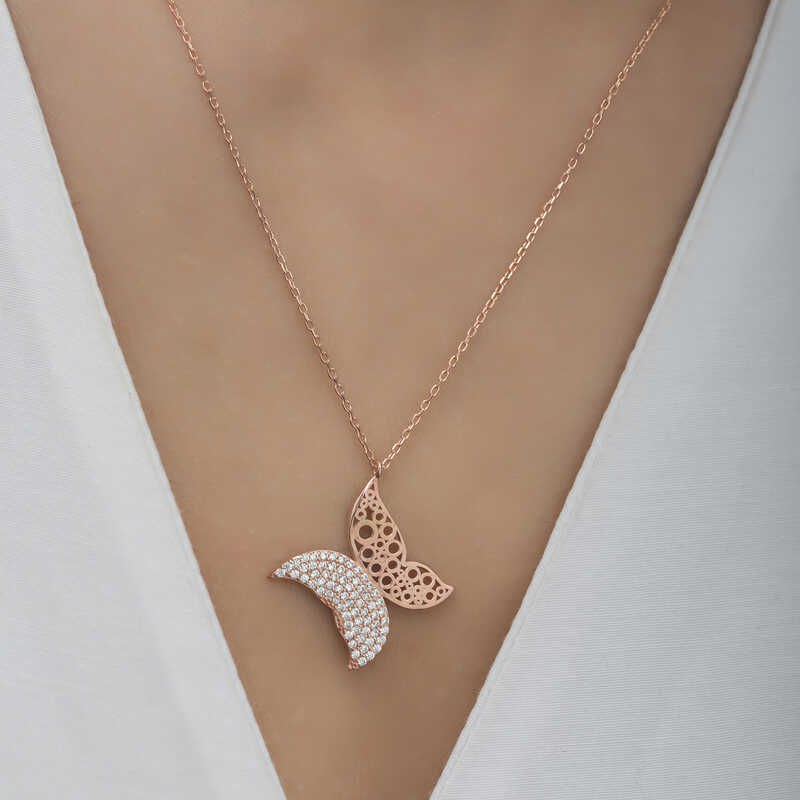 Kelebek; kadınlarca tercih edilen en popüler motiflerden biridir. Sevenlerine doğanın gizemini ve insan hayal gücünün zenginliğini hatırlatır. Özgürlüğü masumiyeti ve saflığı simgeleyen kelebekler, tertemiz sevginin ve aşkın ifadesidir. Sizin olduğu kadar sevdiklerinizin de keyifle takacağı kelebek kadın kolye, sevdiğinize en güzel hediyelerden biri olacaktır. Kolye 925 ayar gümüşten imal edilmiştir. Gümüş üzerine rose kaplama yapılmıştır. Rose kaplama yapılan gümüş kadın kolyeler parlaklığını uzun süre muhafaza eder ve oksitlenmesini geciktirir. Gümüş olan zincir boyu ortalama 45 cm"dir. Tüm gümüş kadın kolyelerde olduğu gibi gümüş kelebek kadın kolye modeli de el emeği ile üretilmiştir. Gümüş ve değerli taşlar nedeniyle belirtilen ortalama ürün ağırlığında ± %10 sapma olabilmektedir.