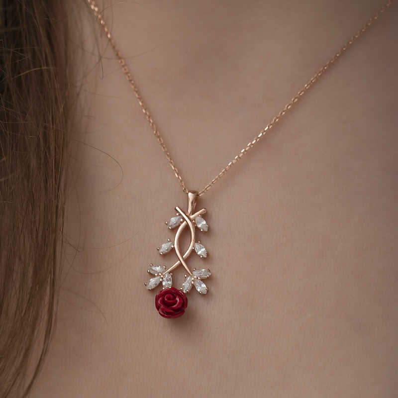 Havaların ısınmasıyla birlikte canlanan doğa, ilkbaharın geldiğini müjdeler. Yeşile bürünen ağaçlar, rengarenk çiçekler açar ve eşsiz kokuları ile bizi karşılar. Doğadan ilham alınarak tasarlanan bu kolye yeniden doğuşu ilkbaharı sembolize etmektedir. Bu şık kolye; doğum günü hediyesi, sevgililer günü veya özel günlerde tercih edilebilecek mükemmel bir seçenektir. Kolye; 925 ayar gümüşten imal edilmiştir.Gümüş üzerine rose kaplama yapılmıştır.Rose kaplama yapılan ürünler gümüşe pembe bakır rengi verir. Diğer kolyelerde olduğu gibi gümüş kırmızı gül kolye de el emeği ile üretilmiştir. Gümüş ve değerli taşlar nedeniyle belirtilen ortalama ürün ağırlığında ± %10 sapma olabilmektedir.