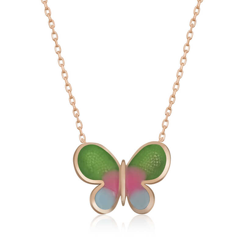 Özgürlüğü masumiyeti ve saflığı simgeleyen kelebekler, tertemiz sevginin ve aşkın ifadesidir. Bahar kelebekleri kolye anlam itibari ile aşkın küçük bir kıvılcım ile başladığı daha sonra büyük bir sabır ile büyüdüğü ve en sonunda ilan-ı aşkı ifade eder. Sizin olduğu kadar sevdiklerinizin de keyifle takacağı minimal kelebek bayan kolye en güzel hediyelerden biri olacaktır. Kolye 925 ayar gümüşten imal edilmiştir. Gümüş üzerine rose kaplama yapılmıştır. Rose kaplama yapılan gümüş bayan kolyeler parlaklığını uzun süre muhafaza eder, ve oksitlenmeyi geciktirir. Kolye üzerinde bulunan renkler mine işlemesidir. Gümüş olan zincir boyu ortalama 45 cm"dir. Tüm gümüş bayan kolyelerde olduğu gibi gümüş minimal kelebek bayan kolye de el emeği ile üretilmiştir. Gümüş ve değerli taşlar nedeniyle belirtilen ürün ağırlığında ± %10 sapma olabilmektedir.