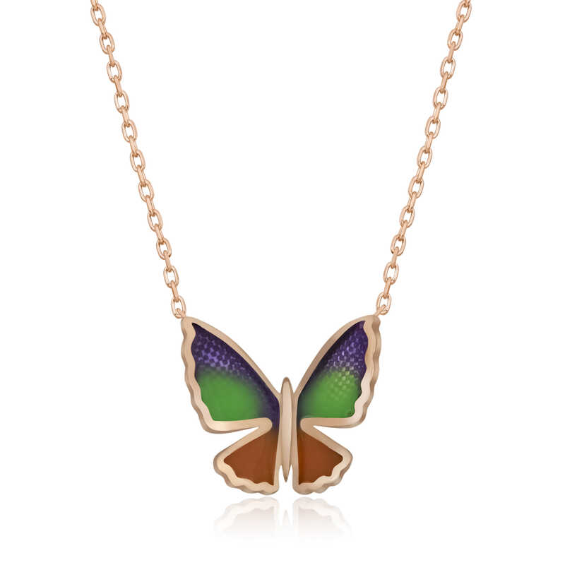 Özgürlüğü masumiyeti ve saflığı simgeleyen kelebekler, tertemiz sevginin ve aşkın ifadesidir. Bahar kelebekleri kolye anlam itibari ile aşkın küçük bir kıvılcım ile başladığı daha sonra büyük bir sabır ile büyüdüğü ve en sonunda ilan-ı aşkı ifade eder. Sizin olduğu kadar sevdiklerinizin de keyifle takacağı minimal kelebek bayan kolye en güzel hediyelerden biri olacaktır. Kolye 925 ayar gümüşten imal edilmiştir. Gümüş üzerine rose kaplama yapılmıştır. Rose kaplama yapılan gümüş bayan kolyeler parlaklığını uzun süre muhafaza eder, ve oksitlenmeyi geciktirir. Kolye üzerinde bulunan renkler mine işlemesidir. Gümüş olan zincir boyu ortalama 45 cm"dir. Tüm gümüş bayan kolyelerde olduğu gibi gümüş minimal kelebek bayan kolye de el emeği ile üretilmiştir. Gümüş ve değerli taşlar nedeniyle belirtilen ürün ağırlığında ± %10 sapma olabilmektedir.