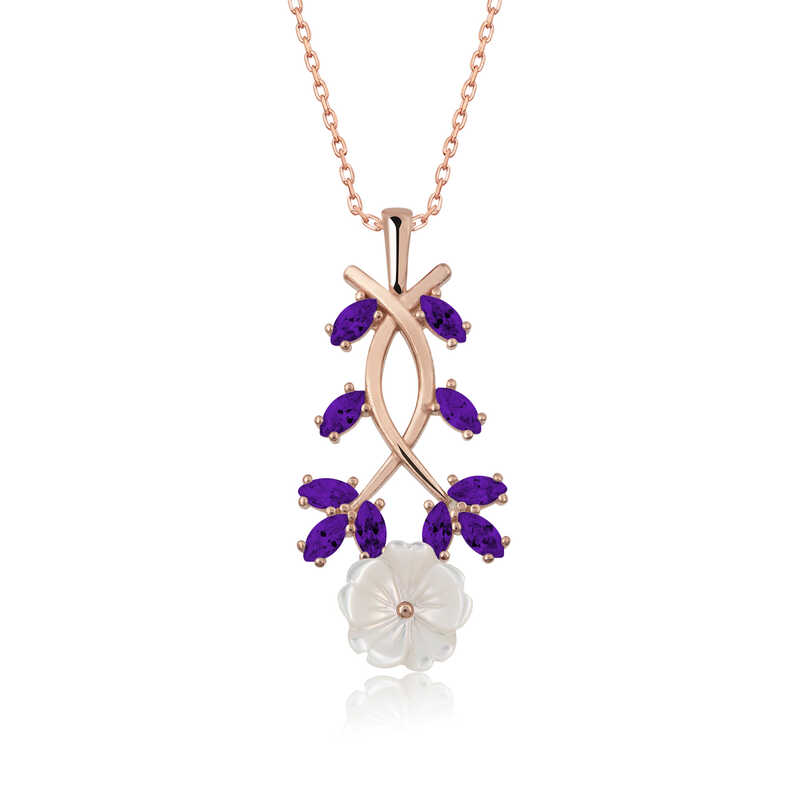 Gümüş Rose Mor Yapraklı Bahar Çiçeği Kolye