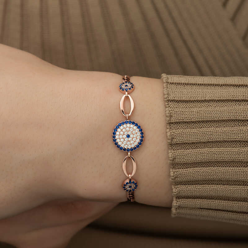 Nazar boncuğunu insanlar uzun yıllardan beri kötü bakıştan korunmak için kullanmışlardır. Kötü bakışların insanlar üzerinde olumsuz etki oluşturmasına karşı bir önlemdir, nazar boncuğu… Bu sebeptendir ki insanlar sevdiklerini korumak için nazar boncuğu takmaktadır. Bu nazar boncuklu bileklik de şıklığı ve zarafeti yansıtıyor. Her dönem sevilen ve şıklığından ödün vermeyen bu modeli ; doğum günü hediyesi, sevgililer günü hediyesi veya annelere hediye olarak özel günlerde tercih edebilirsiniz. Gümüş rose nazar boncuklu bayan bileklik, 925 ayar gümüşten imal edilmiştir. Gümüş üzerine rose kaplama yapılmıştır. Rose kaplama yapılan gümüş bayan bileklikler parlaklığını uzun süre muhafaza eder, oksitlenmesi gecikir. Üzerinde bulunan taşlar zirkondur. Tüm gümüş bayan bilekliklerinde olduğu gibi bu gümüş rose nazar boncuklu bayan bileklik modeli de tamamen el emeği ile üretilmiştir. Gümüş ve değerli taşlar nedeniyle belirtilen ortalama ürün ağırlığında ± %10 sapma olabilmektedir.