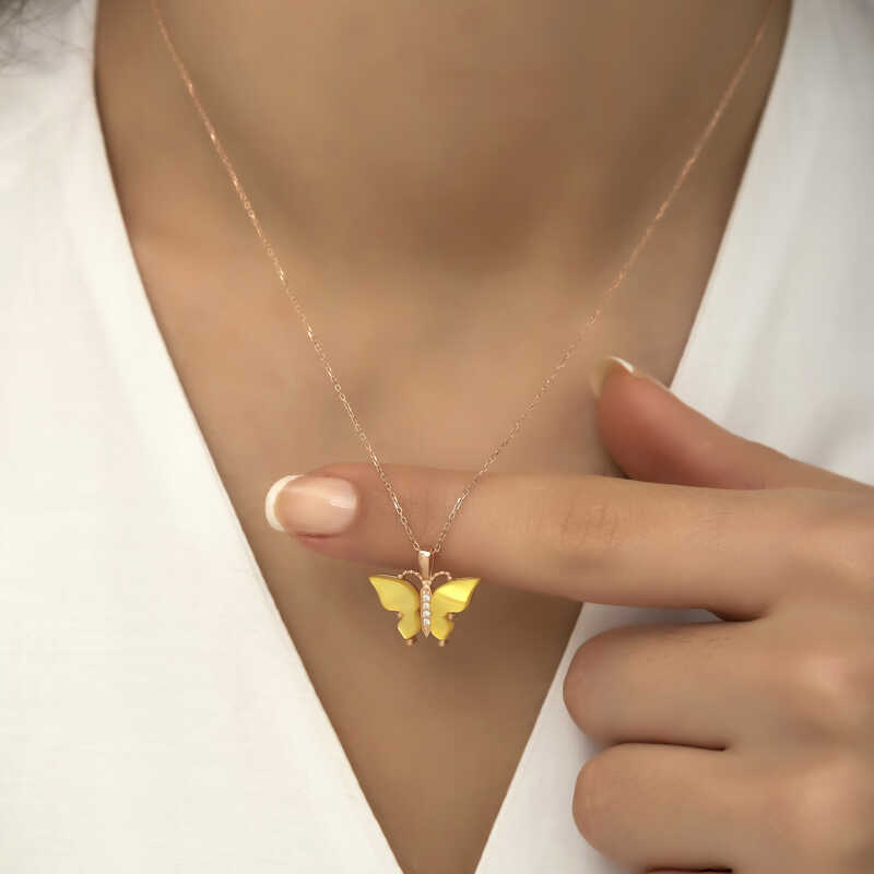 Gümüş Rose Sarı Kaplangözü Taşlı Kelebek Kolye