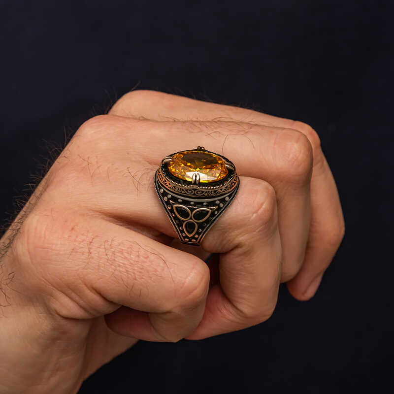Gümüş Sarı Sitrin Zirkon Taşlı Erkek Yüzük