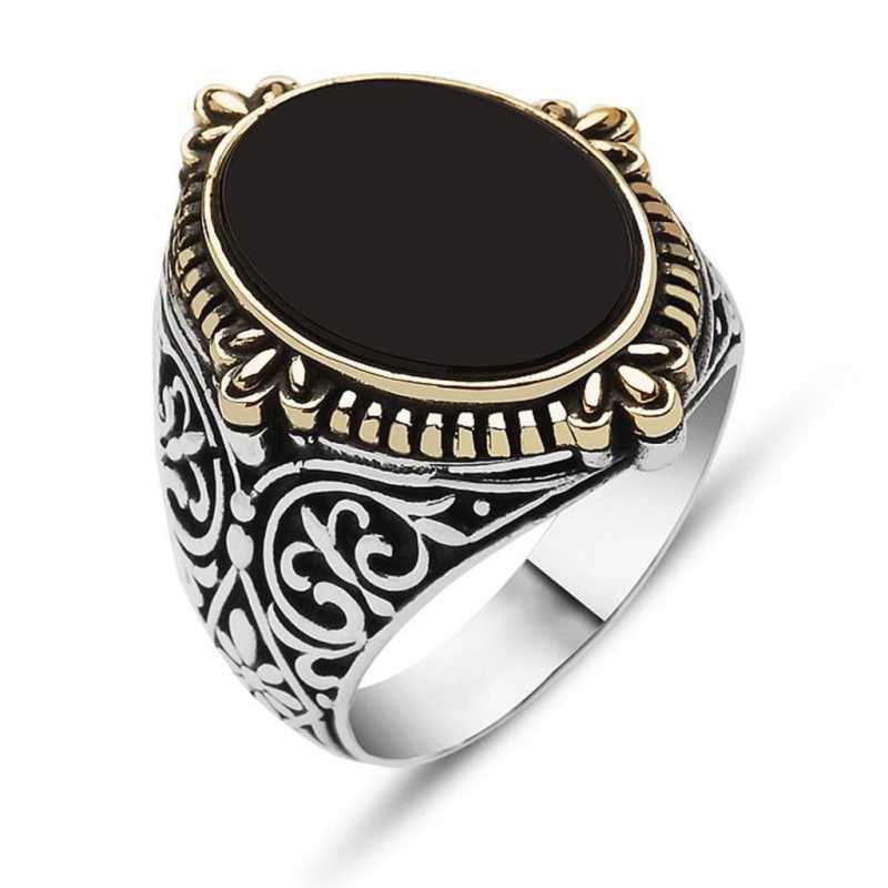 Gümüş Siyah Taşlı Çiçek Desenli Erkek Yüzük
