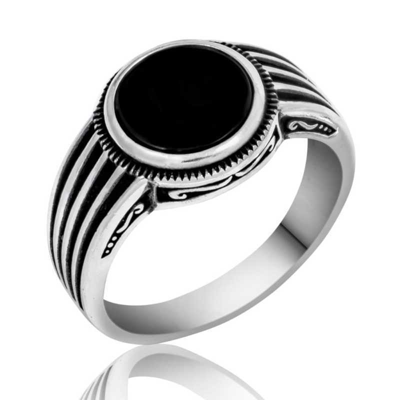 Gümüş Siyah Taşlı Çizgili Erkek Yüzük