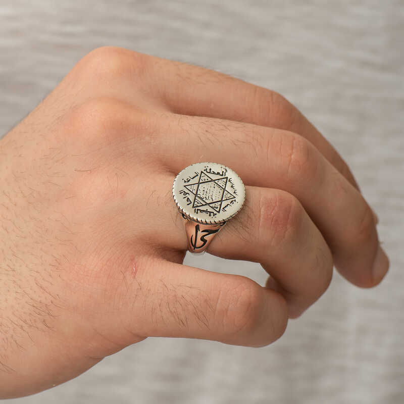 Bu mührün bulunduğu yüzük, Adem a.s.’ın kullandığı ve dünyaya gelirken cennette bıraktığı, daha sonra Cebrail a.s tarafından Cenab-Hakkın izniyle Davud a.s.’a getirilmiştir. Oğlu Süleyman a.s layık olduğundan ona verilmiştir. Öncelikle yüce Allah"ın ın celal ve cemal sıfatlarını sembolize eder. Bu mühür remizdir, rahmani bir semboldür. Siz de Gümüş Süleyman Mührü Yüzüğü sevdiklerinize armağan edebilirsiniz. Gümüş üzerine oksit kaplama yapılmıştır. Ürünlerimizin tamamı el emeği ile üretilmiştir. Gümüş ve değerli taşlar nedeniyle belirtilen ortalama ürün ağırlığında ± %10 sapma olabilmektedir.