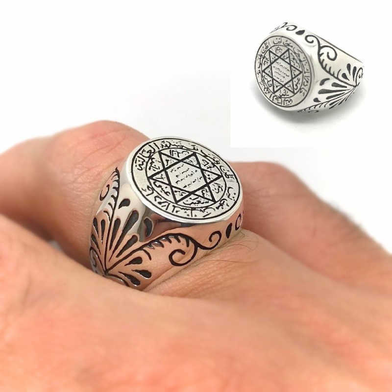 Bu mührün bulunduğu yüzük, Adem a.s.’ın kullandığı ve dünyaya gelirken cennette bıraktığı, daha sonra Cebrail a.s tarafından Cenab-Hakkın izniyle Davud a.s.’a getirilmiştir. Oğlu Süleyman a.s layık olduğundan ona verilmiştir. Öncelikle yüce ALLAH’ın CELAL ve CEMAL sıfatlarını sembolize eder. Bu mühür remizdir, rahmani bir semboldür. Sizde Gümüş Süleyman Mührü Yüzüğü sevdiklerinize armağan edebilirsiniz. Yüzük 925 ayar gümüşten imal edilmiştir. Gümüşe oksit kaplama yapılmıştır. Ürünlerimizin tamamı el emeği ile üretilmiştir. Gümüş ve değerli taşlar nedeniyle belirtilen ortalama ürün ağırlığında ± %10 sapma olabilmektedir.