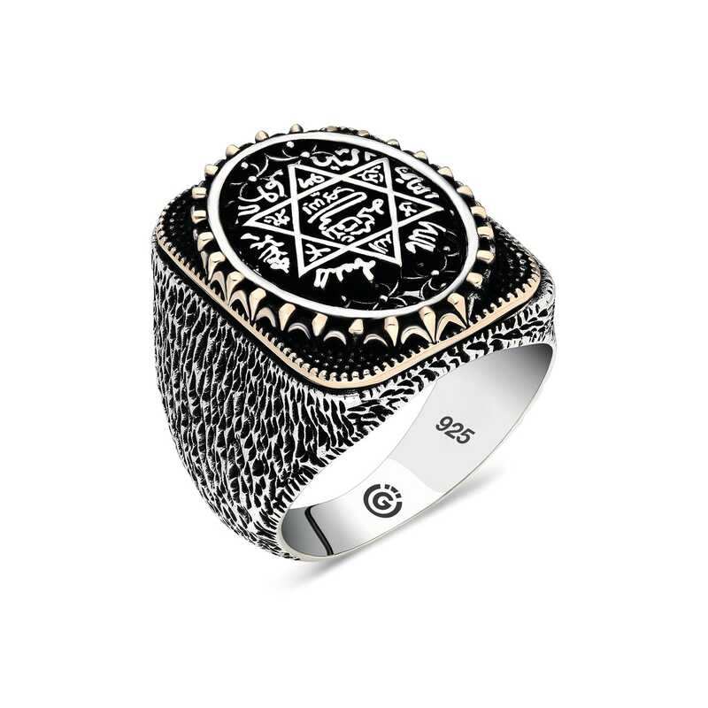Gümüş üzerindeki süleyman mührü oval erkek yüzük modeli günün her anında kullanabileceğiniz şık bir aksesuardır. Bu yüzüğü; kendinize ya da sevdiklerinize doğum gününde, babalar gününde ya da özel günlerde hediye edebilirsiniz. Süleymam mührü oval erkek yüzük modeli 925 ayar gümüşten imal edilmiştir. Gümüş üzerine oksit kaplama yapılmıştır. Oksit kaplama yapılan gümüş erkek yüzük modelleri parlaklığını uzun süre muhafaza eder. Tüm erkek yüzüklerde olduğu gibi gümüş süleyman mührü oval erkek yüzük modeli de el emeği ile üretilmiştir. Gümüş ve değerli taşlar nedeniyle belirtilen ortalama ürün ağırlığında ± %10 sapma olabilmektedir.