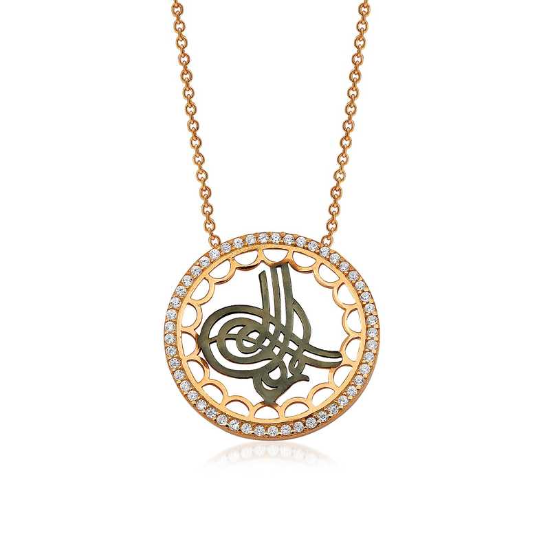 Osmanlı imparatorluğundaki padişahların imzası olarak da kullandığı tuğra sembolü kolye ile birleşerek anlamlı bir gümüş takı haline gelmiştir. Böylelikle sevdiklerinizi veya kendinizi derin bir anlama sahip olan bu kolye ile sevindirebilirsiniz. Tuğra bayan kolye modeli 925 ayar gümüşten imal edilmiştir. Gümüş üzerine rose altın kaplama yapılmıştır. Rose altın kaplama yapılan gümüş bayan kolye modelleri parlaklığını uzun süre muhafaza eder. Kolye üzerinde bulunan beyaz taşlar zirkondur. Gümüş olan zincir boyu ortalama 45 cm"dir. Gümüş tuğralı bayan kolye modeli diğer tüm gümüş bayan kolye modellerinde olduğu gibi el emeği ile üretilmiştir. Gümüş ve değerli taşlar nedeniyle belirtilen ürün ağırlığında ± %10 sapma olabilmektedir.