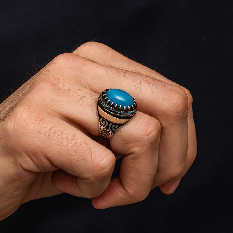 Turkuaz taş, tarih boyunca bir koruyucu taş olarak kabul edilmiştir. Bu taşın, sahibini olumsuz enerjilerden koruduğuna inanılır.Kendinize yada sevdiklerinize doğum gününde, babalar gününde yada özel günlerde hediye edebilirsiniz. Gümüş üzerine oksit kaplama yapılmıştır. Oksit kaplama yapılan gümüş erkek yüzük modelleri parlaklığını uzun süre muhafaza eder, oksitlenmesi gecikir. Gümüş ve değerli taşlar nedeniyle belirtilen ortalama ürün ağırlığında ± %10 sapma olabilmektedir.