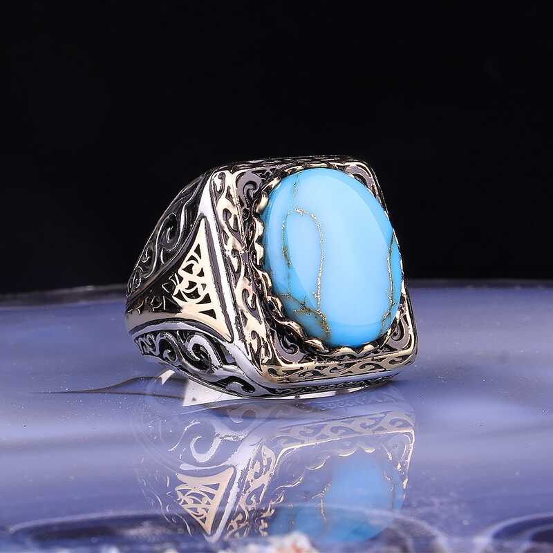 Gümüş üzerindeki turkuaz taştan oluşan bu erkek yüzük modeli günün her anında kullanabileceğiniz şık bir aksesuardır. Bu yüzüğü; kendinize ya da sevdiklerinize doğum gününde, babalar gününde ya da özel günlerde hediye edebilirsiniz. Turkuaz taşlı erkek yüzük modeli 925 ayar gümüşten imal edilmiştir. Gümüş üzerine oksit kaplama yapılmıştır. Oksit kaplama yapılan gümüş erkek yüzük modelleri parlaklığını uzun süre muhafaza eder. Tüm erkek yüzüklerde olduğu gibi gümüş turkuaz taşlı erkek yüzük modeli de el emeği ile üretilmiştir. Gümüş ve değerli taşlar nedeniyle belirtilen ortalama ürün ağırlığında ± %10 sapma olabilmektedir.