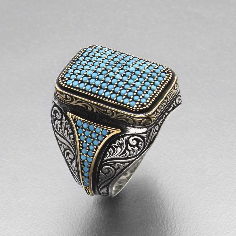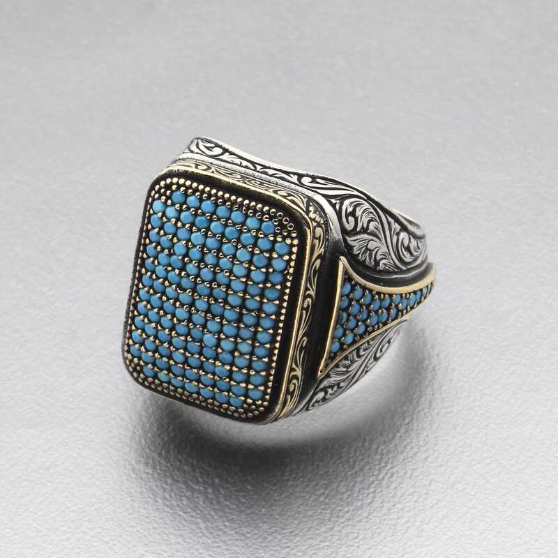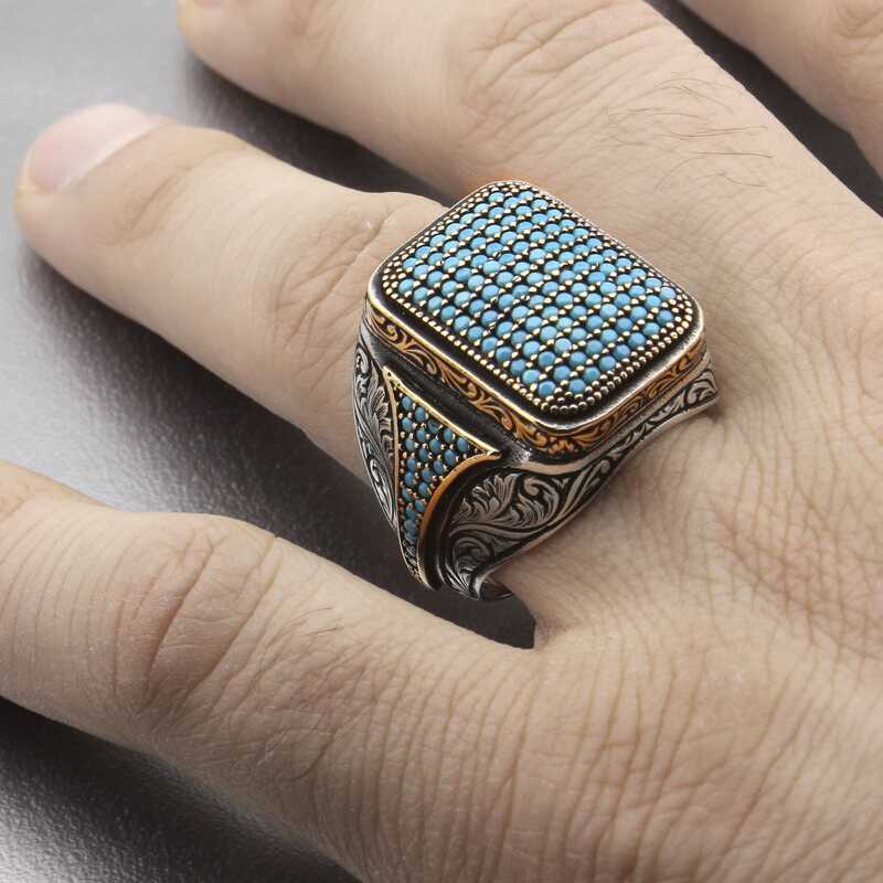 Gümüş Turkuaz Zirkon Taşlı Kare Erkek Yüzük
