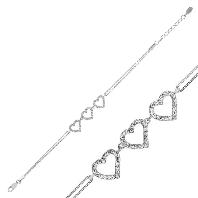 Aşkı bütün saflığı, doğallığı ve içtenliğiyle anlatmanın yoludur kalp… Sonsuz aşkı anlatmak için oluşturulan bu özel tasarımı sevgilinize doğum günü , sevgililer günü yada özel günlerde hediye ederek onları mutlu edebilirsiniz… Bu aşk dolu bileklik 925 ayar gümüşten üretilmiştir. Gümüş üç kalpli bayan bileklik üzerinde bulunan taşlar zirkondur. Bu bayan gümüş bileklik üzerine rodyum kaplama yapılmıştır. Rodyum kaplama yapılan bileklikler parlaklığını uzun süre muhafaza eder ve oksitlenmeyi geciktirir. Tüm gümüş bilekliklerde olduğu gibi bu gümüş üç kalpli bayan bileklik de el emeği ile üretilmiştir. Gümüş ve değerli taşlar nedeniyle ürün ağırlığında ± %10 sapma olabilmektedir.