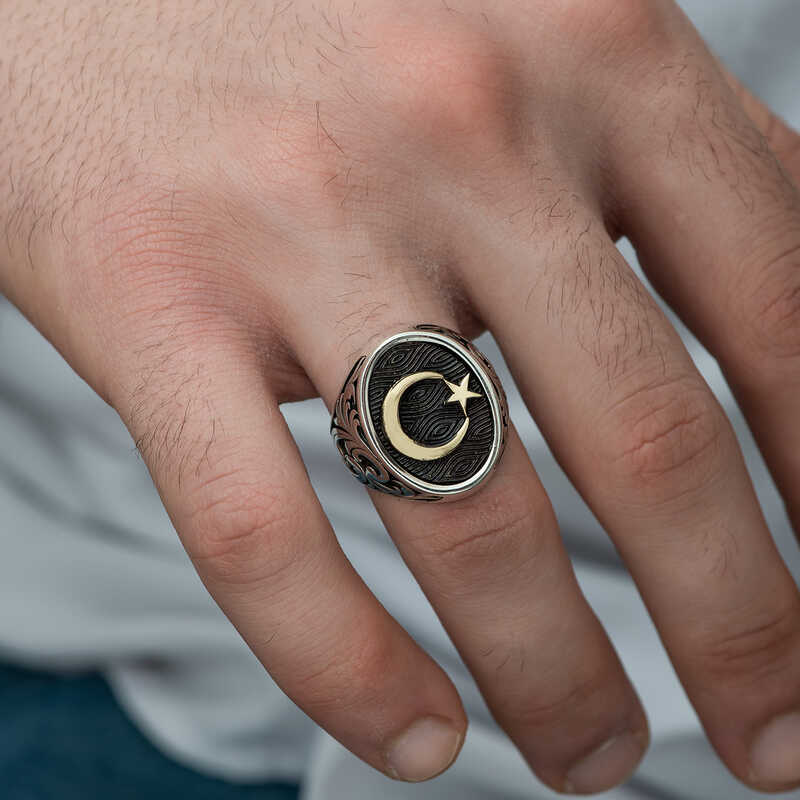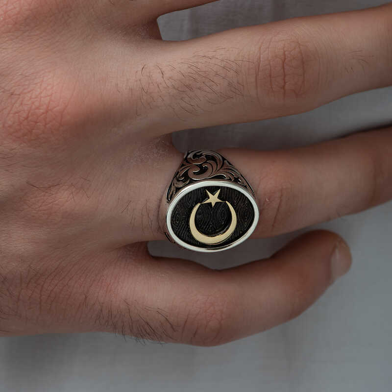 Hilal ve yıldız ya da ay-yıldız; hilal ve hilalin açık ucunda yer alan bir yıldız şeklinden oluşan antik sembol. Bu sembolün kullanıldığı bayraklara çoğunlukla Akdeniz civarında, Orta Doğu ve Orta Asya"da rastlanır. Günümüzde çoğunlukla İslam ülkelerinin bayraklarında kullanılan bir sembol olarak bilinmektedir. Ay- Yıldız simgesi, Türk Bayrağı dahil bir çok bayrakta yer almaktadır. Ay ya da Hilâl, İslâm dini ile özdeşleşmesine rağmen, İslâm öncesi dönemlerde de kullanılmış; Ay- Yıldız ve Güneş motifleri Amerika, Avrupa, Anadolu, Ortadoğu ve Orta Asya panteonunda tarih boyunca yer almıştır. Orta Asya’da İÖ. 5000’lere ait kaya resimlerinden başlayıp daha sonraki şaman davullarında da benzer şekilde tasvir edilen Ay- Yıldız ve Güneş motifleri, Asyalı Türk- Moğol halklarının evren tasarımı hakkında bilgiler sunar. Fakat Ay ile Yıldız’ın birlikte tasvir edildiği ilk belgeler Mezopotamya’da bugünkü Güney Irak’taki Sümer şehirlerinde ortaya çıkmıştır. Tarihte bariz şekilde hilâlden oluşan Ay- Yıldız motifini ilk kez Sümerler kullanmıştır. Sümerler, İÖ. 3000’de Güney Irak’ta tarihin ilk devletini kurmuşlar ve bugünkü medeniyetin inşasında çok büyük adım atmışlardı. Sümer dili Türkçe’ye oldukça yakın bir dildi. İnançları da Türkler’e büyük ölçüde benzer bir yapıdaydı. Sümer Ay Tanrısı “Nana- Suen” ve Güneş Tanrısı “Utu” veya Tanrıça İnana’nın sembolleri bir arada gösterilerek ilk Hilâl- Yıldız ikilemesi yapılmış oldu. Bu motif bazen taş kabartmalarda, bazen mühürlerde bazen de kil tabletlerde işlenmiş ve günümüze kadar ulaşmıştır. Tarihten esinlenerek oluşturulan yanları desenli ay yıldız erkek yüzüğü; kendinize ya da sevdiklerinize doğum gününde, babalar gününde ve özel günlerde hediye edebilirsiniz. Bu şık erkek yüzük 925 ayar gümüşten imal edilmiştir. Gümüş üzerine oksit kaplama yapılmıştır. Oksit kaplama yapılan yüzükler otantik bir görünüme sahip olur. Tüm erkek yüzüklerde olduğu gibi gümüş yanları desenli ay yıldız erkek yüzük modeli de el emeği ile üretilmiştir. Gümüş ve değerli taşlar nedeniyle belirtilen ortalama ürün ağırlığında ± %10 sapma olabilmektedir.