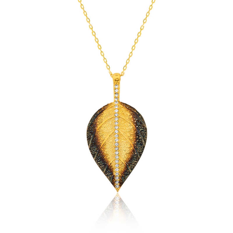 Gençlere ve kendisini genç hisseden tüm bayanlara özel; gümüş ve beyaz zirkon taşın ışıltısı ile yaşam enerjinizi etrafınıza yansıtın. Sizin olduğu kadar sevdiklerinizin de keyifle takacağı bu kolye modeli, sevdiğinize verilebilecek en güzel hediyelerden biri olacaktır. Bu yaprak desenli bayan kolye 925 ayar gümüşten imal edilmiştir. Gümüş üzerine altın kaplama yapılmıştır. Altın kaplama yapılan gümüş bayan kolye modelleri parlaklığını uzun süre muhafaza eder ve oksitlenmesi gecikir. Gümüş bayan kolye üzerinde bulunan taşlar zirkondur. Gümüş olan zincirin boyu ortalama 45 cm"dir. Tüm gümüş bayan kolye modellerinde olduğu gibi bu gümüş yaprak bayan kolye modeli de el emeği ile üretilmiştir. Gümüş ve değerli taşlar nedeniyle belirtilen ortlama ürün ağırlığında ± %10 sapma olabilmektedir.