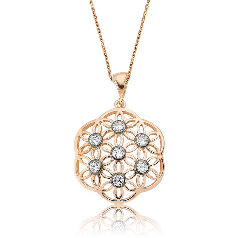 Yaşam çiçeği, yaradılışın bütün sırrını ve bilgisini barındıran tek geometrik şekildir. Gerçekte çember değil küredir. Üç boyutlu olarak hatta çok boyutlu olarak düşünülmelidir. Yaşam çiçeği içinde Platon’un 5 cismin ve Metatron"un küpü"nü barındırır. Bu şekiller de tüm varoluşu inşa ederler. Kadim öğretilerde en güçlü ve özel sembollerden birisi olarak kabul edilen yaşam çiçeği; sonsuzluğun, kusursuzluğun ve mükemmelliğin gücünün özüdür. Siz de sevdiklerinizi ya da kendinizi bu özel kolye ile sevindirebilirsiniz. Yaşam çiçeği bayan kolye modeli 925 ayar gümüşten imal edilmiştir. Gümüş üzerine rose altın kaplama yapılmıştır. Rose altın kaplama yapılan gümüş bayan kolye modelleri parlaklığını uzun süre muhafaza eder ve oksitlenmesi gecikir. Kolye üzerinde bulunan taşlar zirkondur. Gümüş olan zincir boyu ortalama 45 cm"dir. Bu yaşam çiçeği bayan kolye modeli diğer gümüş bayan kolye modellerinde olduğu gibi el emeği ile üretilmiştir. Gümüş ve değerli taşlar nedeniyle belirtilen ortalama ürün ağırlığında ± %10 sapma olabilmektedir.