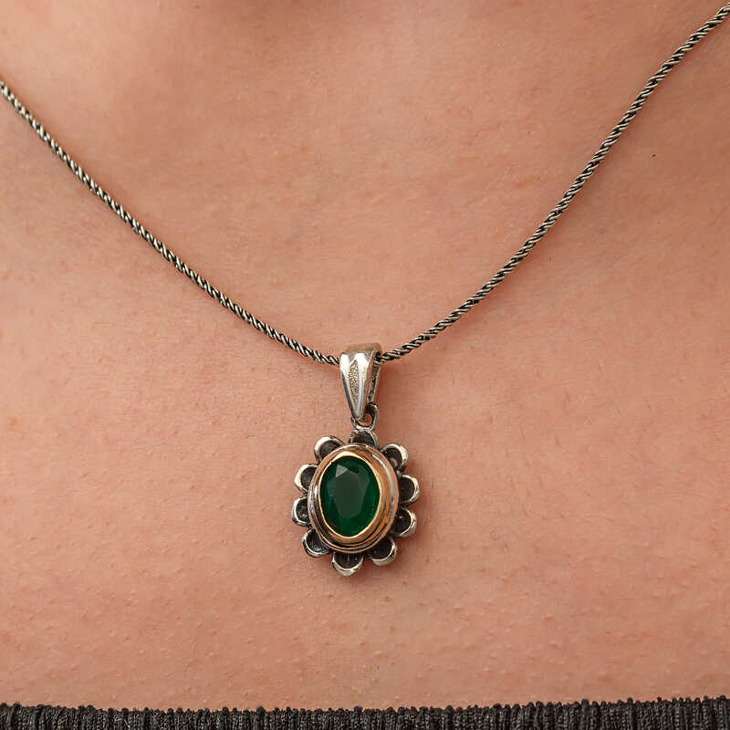 Gümüş Yeşil Çiçek Desenli Otantik Kadın Kolye
