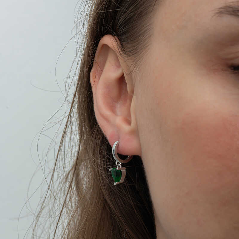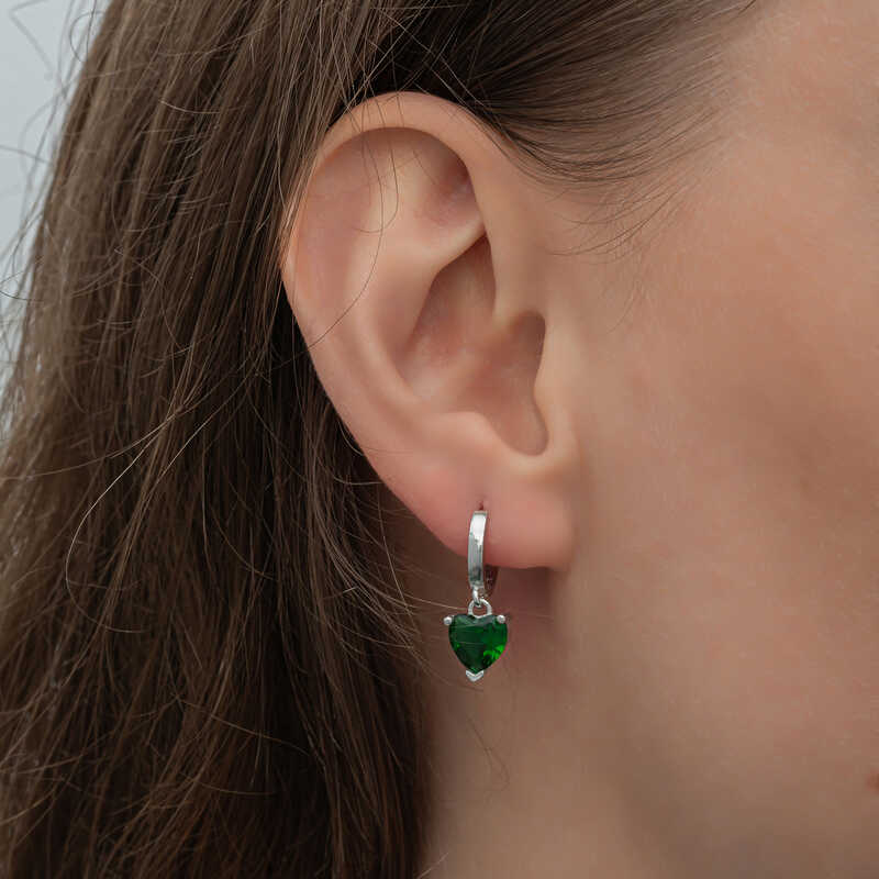 Gümüş Yeşil Taşlı Kalpli Kadın Küpe