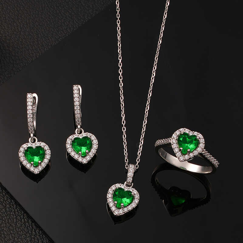 Gümüş Yeşil Taşlı Kalpli Kadın Set