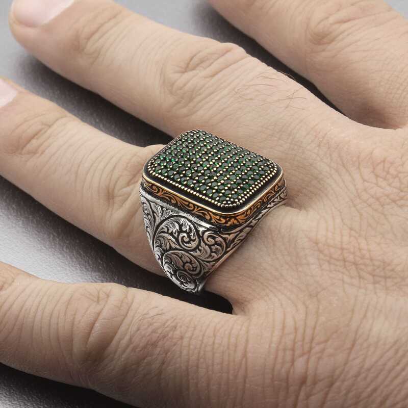 Gümüş Yeşil Zirkon Taşlı Kare Erkek Yüzük