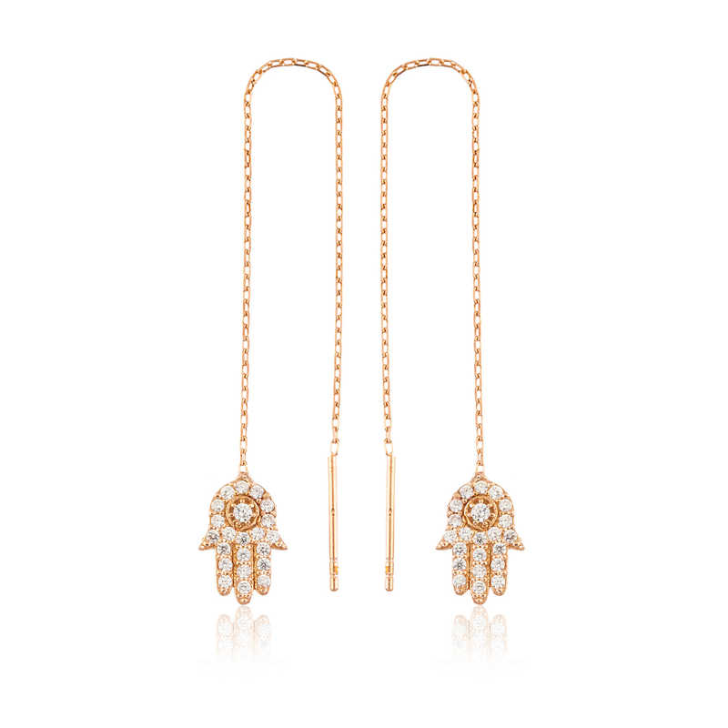 Her ne kadar Hz. Fatma"nın eli olarak bilinse de arapçada “hamse” diye anılır. Hamse, beş anlamına gelir ve bir elin parmak sayısını gösterir. Hz. Fatma bir gün mutfakta helva kavururken, eşi Hz. Ali görür ve pişen helvaya elini daldırır ancak hiçbir şey olmaz, helvayı böyle kavurmayı devam eder. O günden sonra elinin kutsallığına, gücüne adeta yenilmezliğine inanılır. Her güçlük adeta onun eliyle aşılacaktır. Bu eşsiz küpe; doğum günü hediyesi, sevgililer günü hediyesi veya annelere hediye olarak özel günlerde tercih edilebilecek mükemmel bir seçenektir. Bu harika tasarım Fatma eli bayan bayan küpe; 925 ayar gümüşten imal edilmiştir. Gümüş üzerine rose kaplama yapılmıştır. Rose altın kaplama yapılan tüm gümüş küpe modelleri parlaklığını uzun süre muhafaza eder, gümüşü pembe rengine çevirir, oksitlenmeyi geciktirir Küpe üzerinde bulunan beyaz taşlar zirkondur. Tüm gümüş bayan küpelerde olduğu gibi zincirli Fatma eli bayan küpe de el emeği ile üretilmiştir. Gümüş ve değerli taşlar nedeniyle belirtilen ürün ağırlığında ± %10 sapma olabilmektedir.