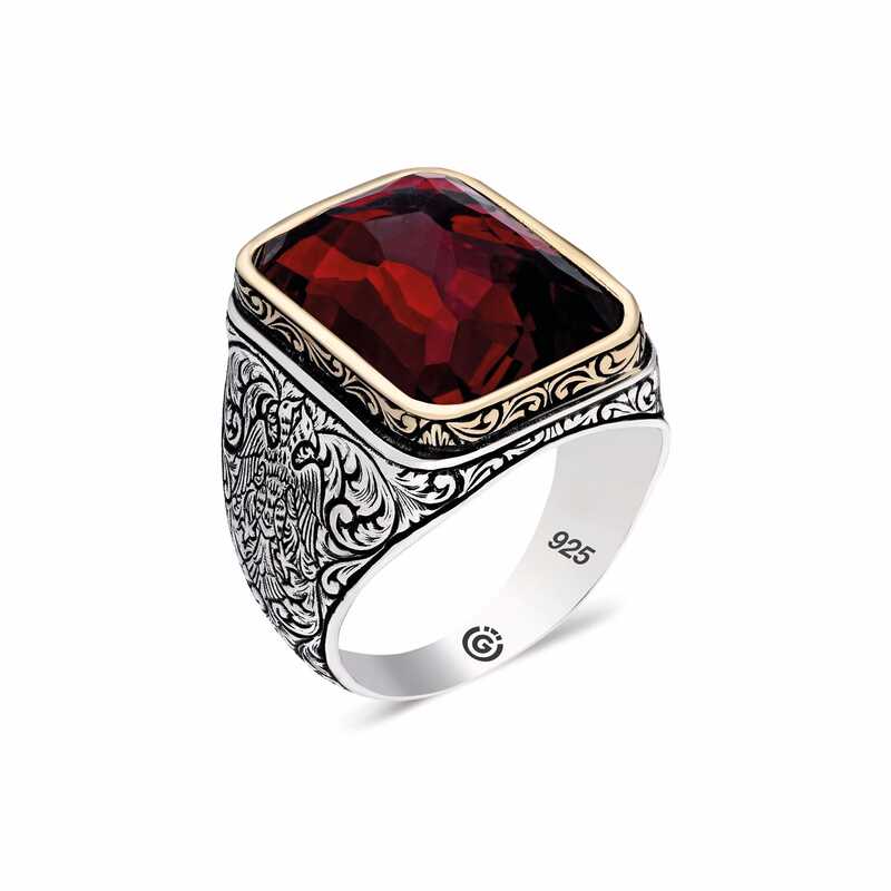 Gümüş Zirkon Kırmıızı Taşlı Kare Erkek Yüzük